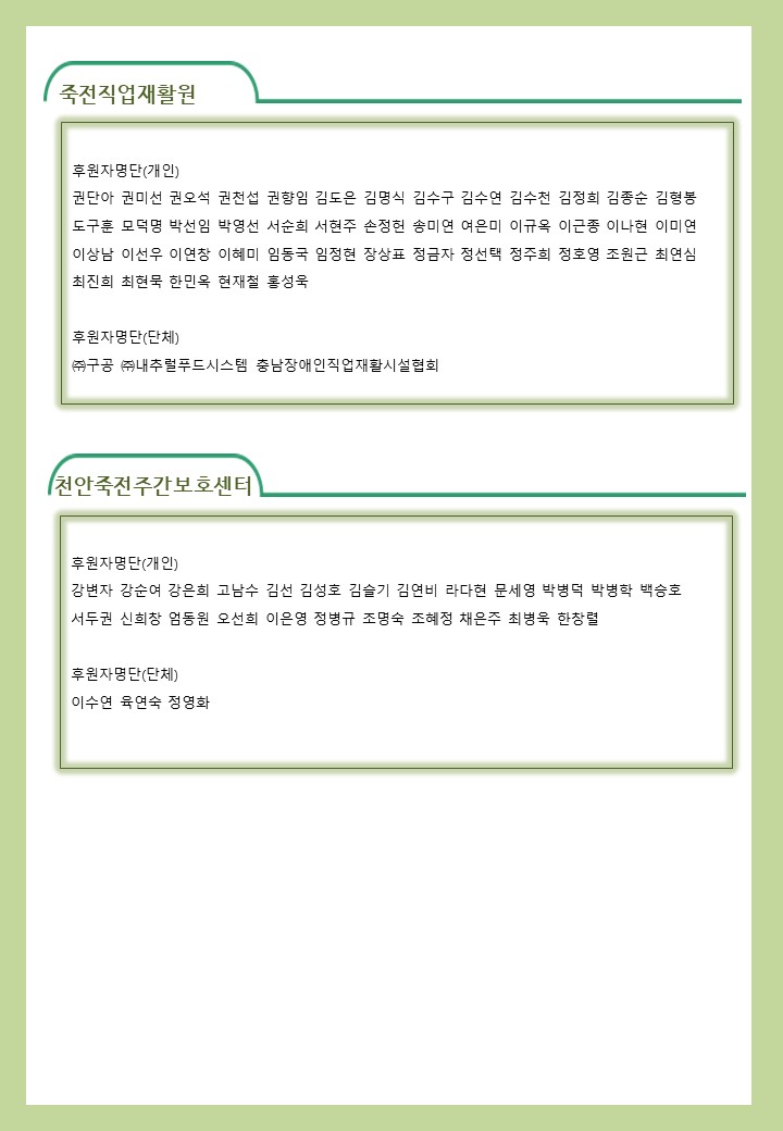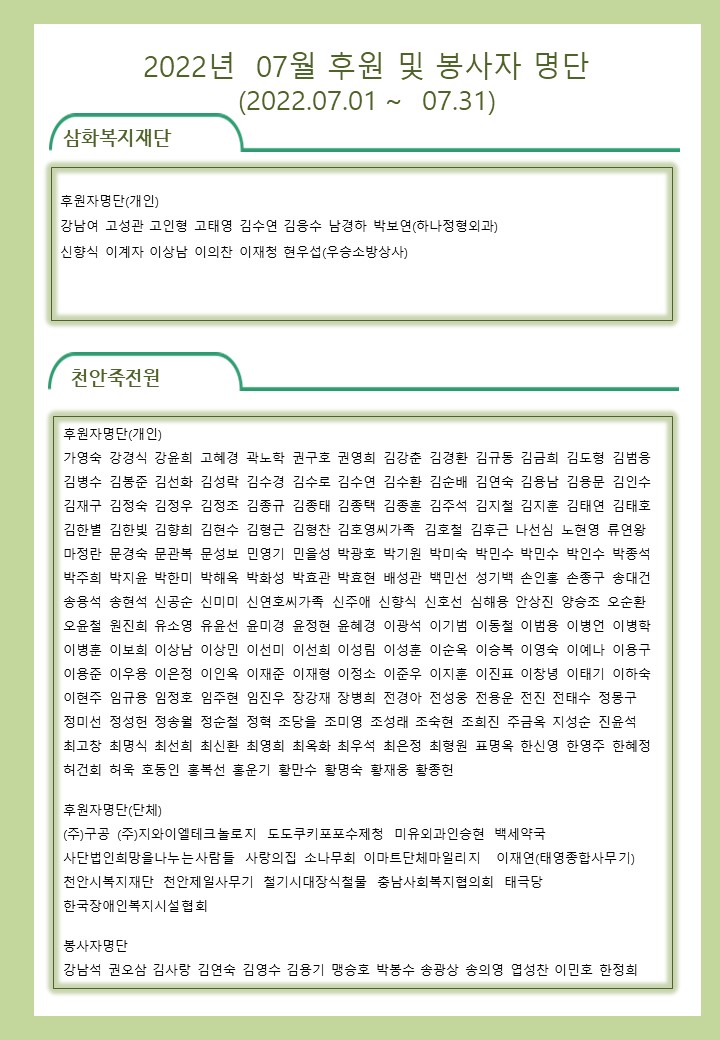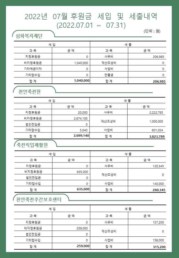 2022년 07월 사회복지법인 삼화복지재단 및 산하시설 후원금 수입·세출내역 및 후원자 명단 공고 페이지 정보 작성자 운영자 작성일22-08-08 19:01 조회4,912회 댓글0건 이전글 다음글 목록 본문 2022년 07월 사회복지법인 삼화복지재단 및 산하시설 후원금 수입·세출내역 및 후원자 명단 공고 2022년 07월 후원해 주신 모든 분들께 감사와 사랑을 전합니다. 댓글목록 등록된 댓글이 없습니다. 이전글 다음글 목록