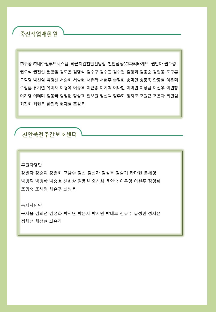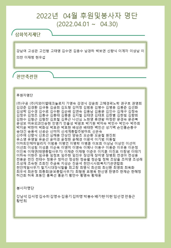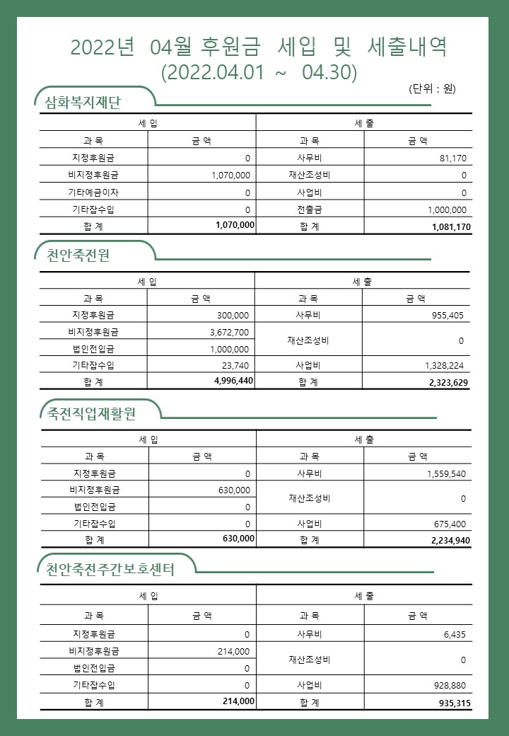 2022년 04월 사회복지법인 삼화복지재단 및 산하시설 후원금 수입·세출내역 및 후원자 명단 공고 페이지 정보 작성자 운영자 작성일22-05-11 09:30 조회5,102회 댓글0건 이전글 다음글 목록 본문 2022년 04월 사회복지법인 삼화복지재단 및 산하시설 후원금 수입·세출내역 및 후원자 명단 공고 2022년 04월 후원해 주신 모든 분들께 감사와 사랑을 전합니다. 댓글목록 등록된 댓글이 없습니다. 이전글 다음글 목록