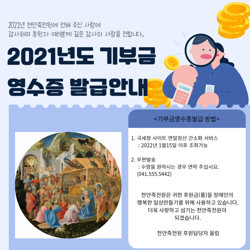 2021년 기부금영수증 발급안내 페이지 정보 작성자 운영자 작성일22-01-10 18:49 조회4,931회 댓글0건 이전글 다음글 목록 본문 댓글목록 등록된 댓글이 없습니다. 이전글 다음글 목록
