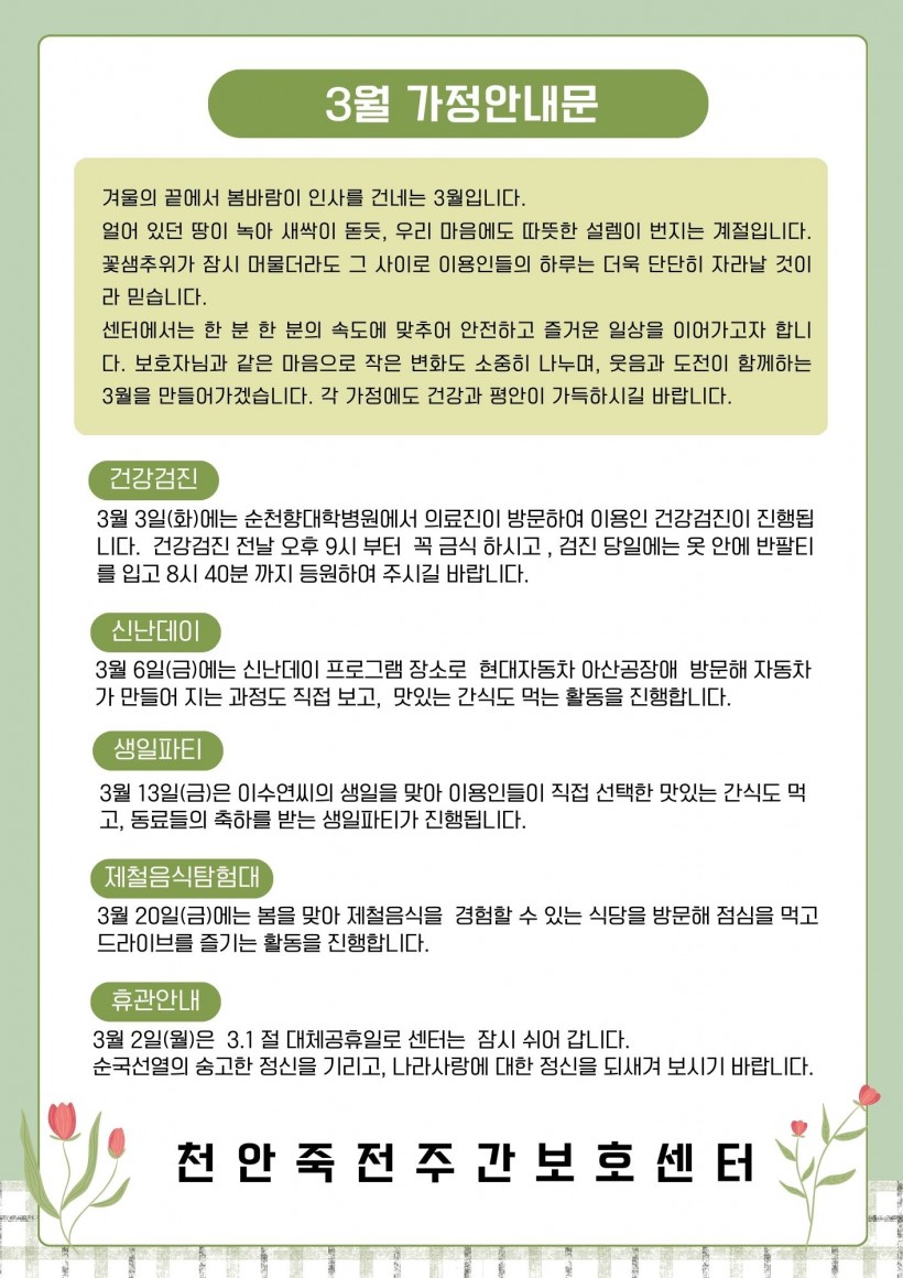 2026년 3월 가정안내문 페이지 정보 작성자 김미리 작성일26-02-26 08:22 조회7회 댓글0건 다음글 목록 본문 3월 가정안내문입니다. 댓글목록 등록된 댓글이 없습니다. 다음글 목록
