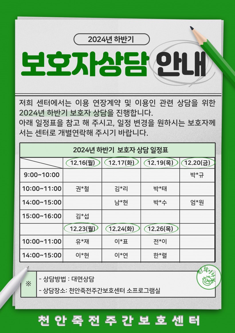 저희 센터에서는 이용 연장 계약 및 이용인 관련 상담을 위한 2024년 하반기 보호자 상담을 진행하고자 합니다.
