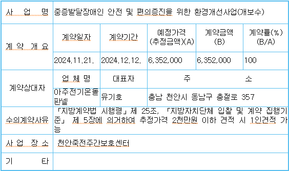 수의계약 내역 공개 페이지 정보 작성자 백승호 작성일24-11-26 13:29 조회2,062회 댓글0건 이전글 다음글 목록 본문 <수의계약 내역 공개> 댓글목록 등록된 댓글이 없습니다. 이전글 다음글 목록