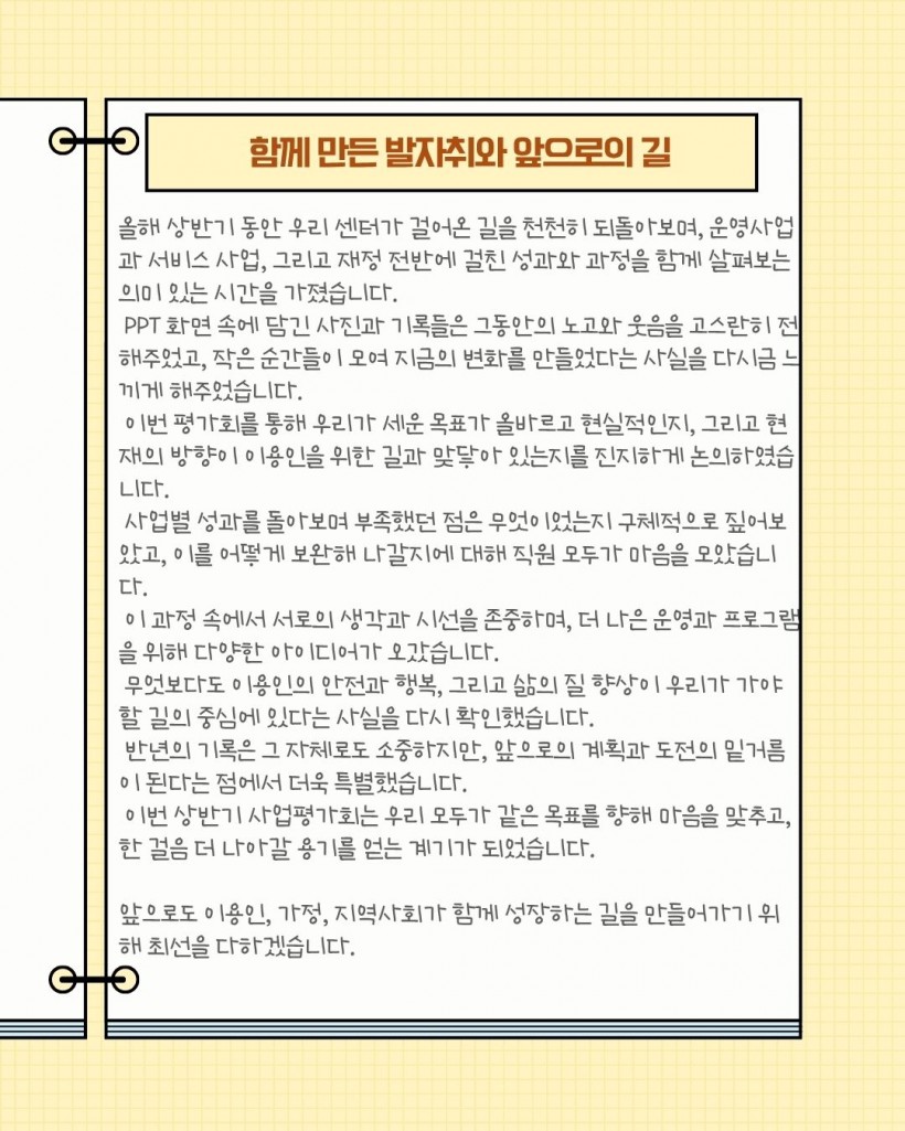 2025년 상반기 사업평가회, 함께 만든 발자취와 앞으로의 길 페이지 정보 작성자 김미리 작성일25-08-08 16:47 조회686회 댓글0건 이전글 다음글 목록 본문 저희 센터에서 진행된 2025년 상반기 사업평가회를 소개합니다. 댓글목록 등록된 댓글이 없습니다. 이전글 다음글 목록