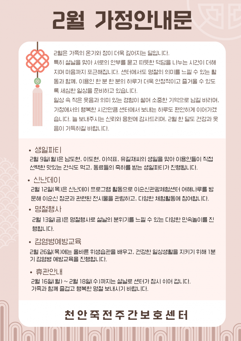2026년 2월 가정안내문 페이지 정보 작성자 김미리 작성일26-01-29 16:17 조회174회 댓글0건 이전글 다음글 목록 본문 2월 가정안내문입니다. 댓글목록 등록된 댓글이 없습니다. 이전글 다음글 목록
