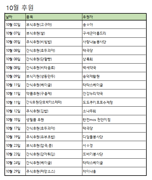 [후원] 10월 후원품 페이지 정보 작성자 운영자 작성일24-11-01 16:43 조회711회 댓글0건 관련링크 목록 본문 10월 후원해주신 모든 후원자님께 다시 한번 감사드립니다~! 댓글목록 등록된 댓글이 없습니다. 목록