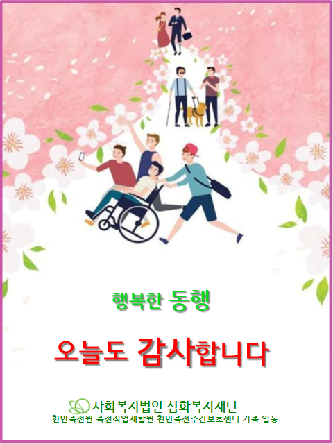 천안죽전원 가족들의 행복한 삶에 동행해 주시는 모든 종사자님, 후원자님, 봉사자님 그리고 지역사회의 모든 기관들께 감사와 사랑을 전합니다.