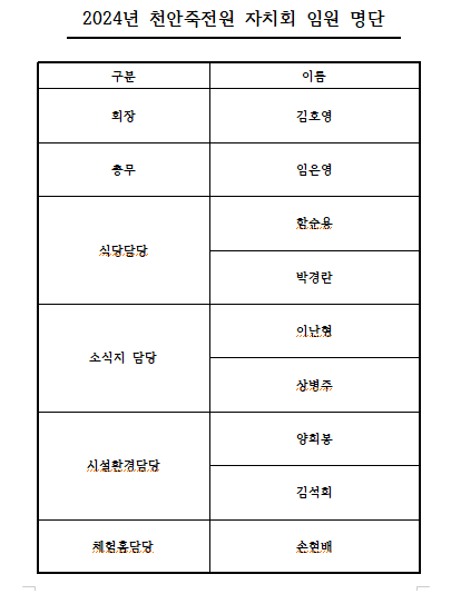 내용: 2024년 천안 죽전원을 이끌어갈 죽전 자치회 임원선출 하였습니다.