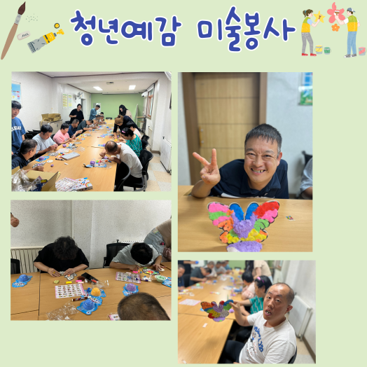[자원봉사] 청년예감 페이지 정보 작성자 운영자 작성일23-09-19 17:10 조회526회 댓글0건 관련링크 목록 본문 23.09.16(토)청년예감에서 미술봉사를 진행해 주셨습니다.이번 미술 프로그램에서는 폼클레이를 이용하여 작품을 만들었습니다.가족들 모두 행복한 시간을 보냈습니다. 댓글목록 등록된 댓글이 없습니다. 목록