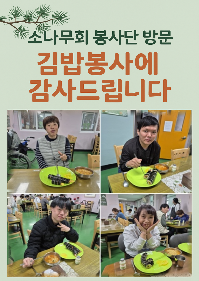 [자원봉사] 소나무회봉사단 페이지 정보 작성자 운영자 작성일25-04-22 11:06 조회402회 댓글0건 관련링크 목록 본문 25.04.13. 소나무회봉사단천안죽전원에 소나무회봉사단이 방문하셔 봉사활동을 진행해 주셨습니다.항상 감사드리고 맛있는 김밥 저희 가족분들이 남김없이 맛있게 드셔주셨습니다.감사합니다! 댓글목록 등록된 댓글이 없습니다. 목록
