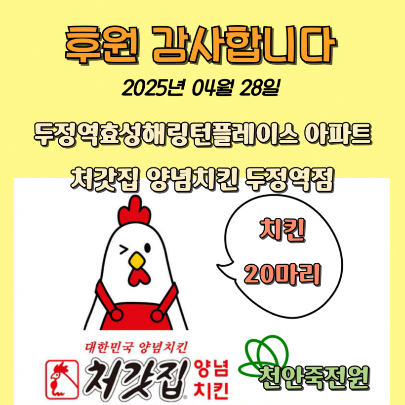[후원] 치킨 후원 페이지 정보 작성자 운영자 작성일25-04-30 09:37 조회596회 댓글0건 관련링크 목록 본문 25.04.28.(월)두정역효성해링턴 플레이스 아파트 와 처갓집 양념치킨 두정역점에서 치킨 20마리 기부해주셨습니다.저희 가족분들이 정신없이 맛있게 식사해주셨습니다. 항상 감사합니다. 댓글목록 등록된 댓글이 없습니다. 목록