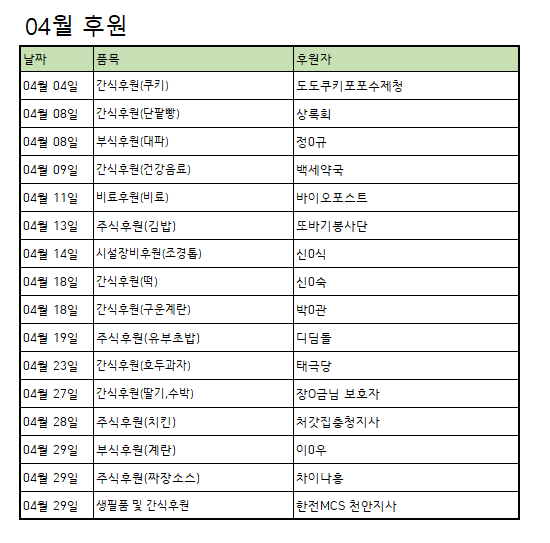 [후원] 4월 후원품 페이지 정보 작성자 운영자 작성일25-05-12 09:45 조회488회 댓글0건 관련링크 목록 본문 25년 04월 후원품 목록입니다.최근 감기, 코로나들이 다시 유행입니다.큰 일교차로 감기가 걸리기 쉬운 날씨입니다.항상 건강에 유념하시고 저희 죽전원에 많은 사랑을 주셔 감사합니다. 댓글목록 등록된 댓글이 없습니다. 목록