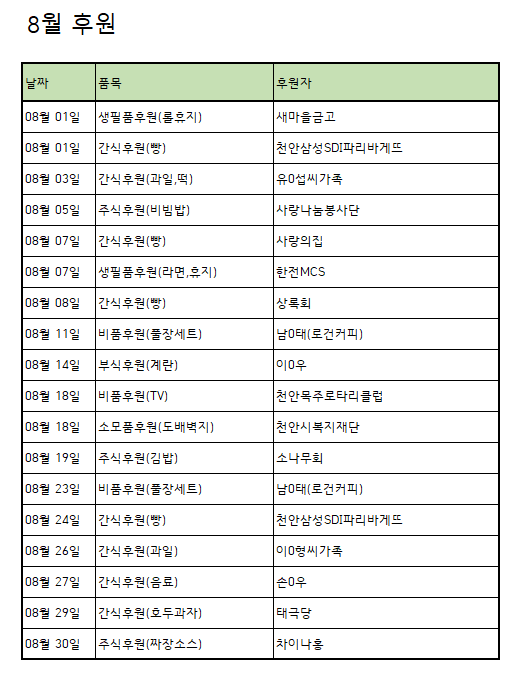 [후원] 8월 후원품 페이지 정보 작성자 운영자 작성일23-09-19 11:59 조회523회 댓글0건 관련링크 목록 본문 8월 후원해주신 모든 후원자님께 다시 한번 감사드립니다~! 댓글목록 등록된 댓글이 없습니다. 목록
