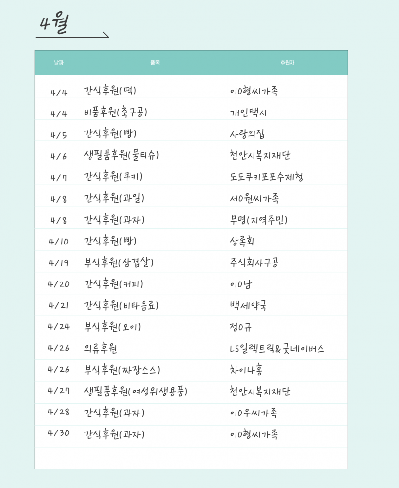 [후원]4월 후원품 페이지 정보 작성자 운영자 작성일23-05-08 17:36 조회447회 댓글0건 관련링크 목록 본문 4월 후원해주신 모든 후원자님께 다시 한번 감사드립니다~! 댓글목록 등록된 댓글이 없습니다. 목록