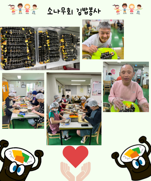 소나무회 자원봉사자분들이 김밥 봉사를 다시 진행해 주셨습니다~ 역시 오랫동안 봉사를 해주셨던 팀이라 능숙하게 김밥을 싸주시는 모습이 대단하였습니다~ 함께 온 학생봉사자분들도 적극적으로 참여하는 모습을 보여주셨습니다. 천안죽전원 가족들 모두 김밥을 맛있게 드셨습니다. 자원봉사를 진행해 주신 소나무회 자원봉사자님들께 다시 한번 감사드립니다~!