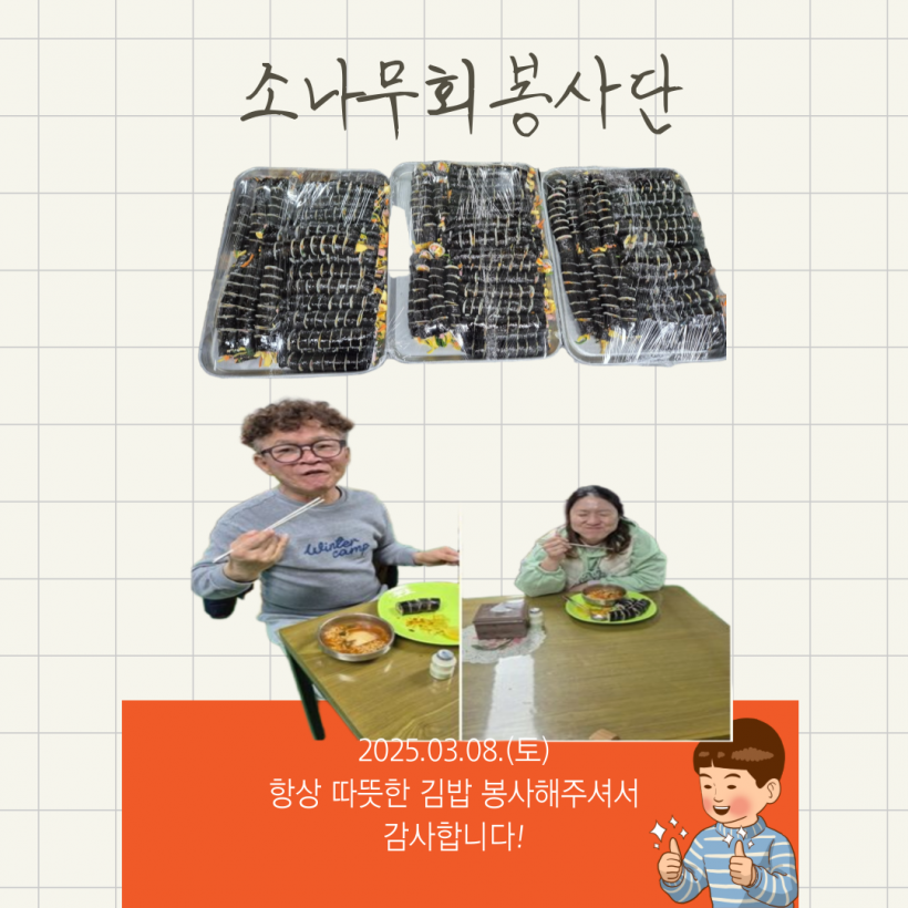 [자원봉사] 소나무회봉사단 페이지 정보 작성자 운영자 작성일25-03-12 13:12 조회424회 댓글0건 관련링크 목록 본문 2025.03.08. 소나무회봉사단에서 김밥봉사 진행해주셨습니다.매월 한번 씩 저희 가족분들에게 맛있는 김밥 봉사해주고 계십니다.항상 감사드립니다. 댓글목록 등록된 댓글이 없습니다. 목록