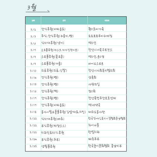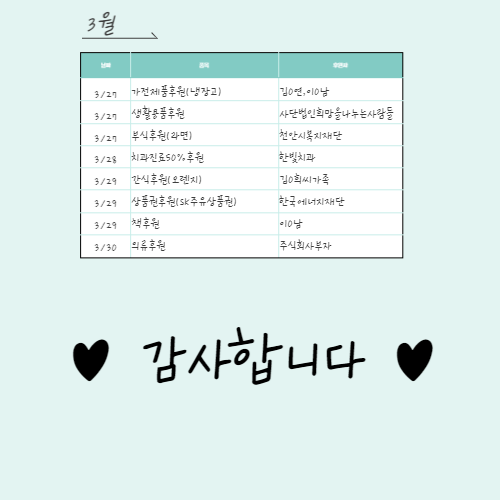 [후원] 3월후원품 페이지 정보 작성자 운영자 작성일23-04-03 17:41 조회389회 댓글0건 관련링크 목록 본문 3월 후원해주신 모든 후원자님께 다시 한번 감사드립니다~! 댓글목록 등록된 댓글이 없습니다. 목록
