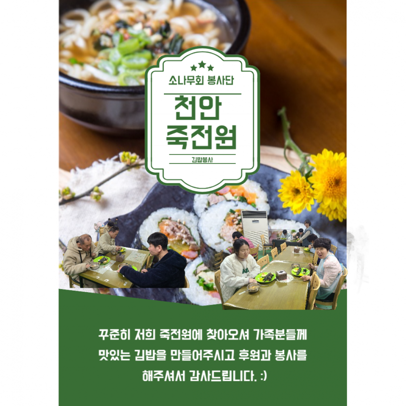 [자원봉사]소나무회봉사단 페이지 정보 작성자 운영자 작성일25-02-05 15:39 조회591회 댓글0건 관련링크 목록 본문 25.01.11 25년에도 다시 찾아와주셔서 죽전원 가족분들께 맛있는 김밥을 후원해주시고 봉사해주셨습니다.감사합니다! 댓글목록 등록된 댓글이 없습니다. 목록
