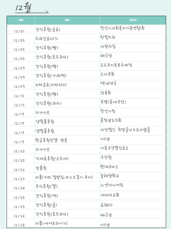 [후원]12월 후원품 페이지 정보 작성자 운영자 작성일22-12-30 12:18 조회310회 댓글0건 관련링크 목록 본문 12월 후원해주신 모든 후원자님께 다시 한번 감사드립니다~! 댓글목록 등록된 댓글이 없습니다. 목록