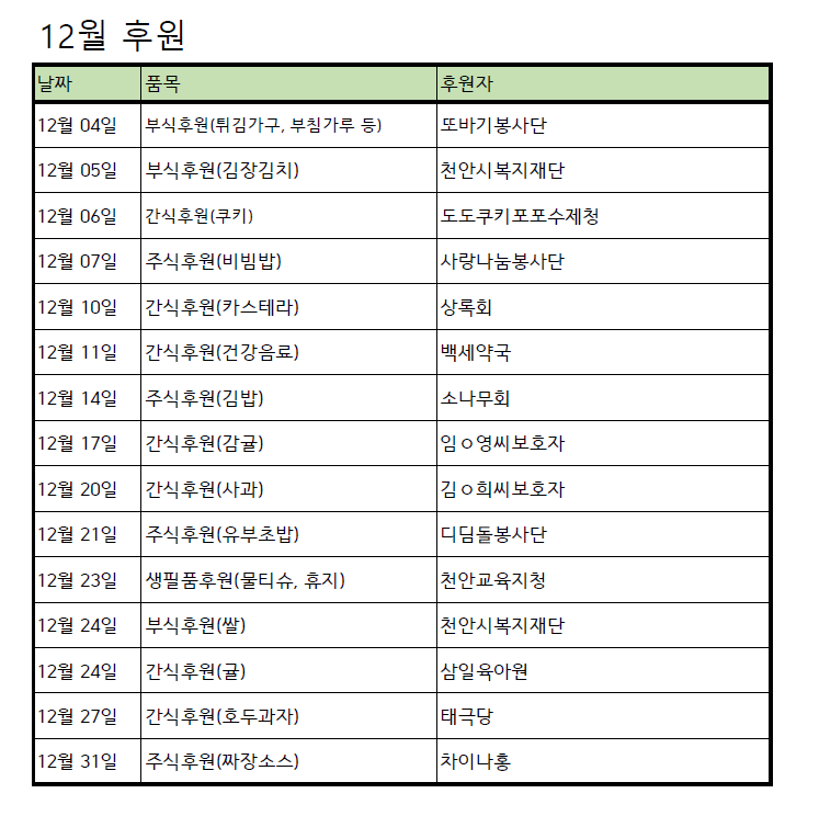 [후원] 12월 후원품 페이지 정보 작성자 운영자 작성일25-01-02 15:20 조회475회 댓글0건 관련링크 목록 본문 12월 후원해주신 모든 후원자님께 다시 한번 감사드립니다~! 댓글목록 등록된 댓글이 없습니다. 목록