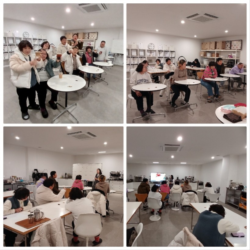 2024.12.07(토) 2번째로 시작된 커피바리스타 수업에 참여한 임영재, 이화순, 문영로, 함순용, 서다원, 허금미, 임은영, 이윤우님 첫날이라 설레는 마음으로 학원으로 향해 진지하게 수업에 임했습니다. 커피향이 좋다고 환한 웃음을 짓는 영로님 첫수업 어땠나요?