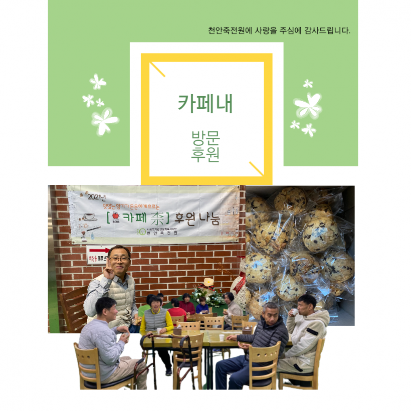 [후원]카페내 페이지 정보 작성자 운영자 작성일21-12-06 13:53 조회326회 댓글0건 관련링크 목록 본문 2021.12.03.(금)카페내에서 방문하여 빵과커피를 후원해주셨습니다.정기적으로 지원해주셔서 감사합니다.손수 만든 쿠키와 커피 감사합니다 :) 댓글목록 등록된 댓글이 없습니다. 목록