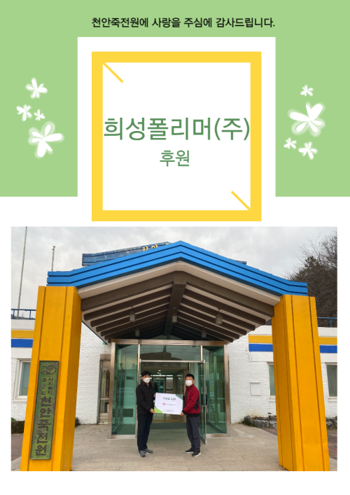 [후원] 희성폴리머(주) 페이지 정보 작성자 운영자 작성일21-12-09 18:32 조회399회 댓글0건 관련링크 목록 본문 2021.12.09.(목) 희성폴리머(주)에서 방문하셨습니다.후원금을 통해 죽전원 방풍문 설치를 완료하였습니다희성폴리머에 지원으로 따뜻한 실내 조성에 한걸음 다가가는 모습입니다.감사합니다 :) 댓글목록 등록된 댓글이 없습니다. 목록