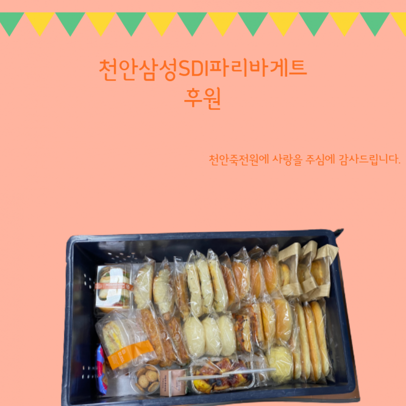 [후원]천안삼성SDI파리바게트 페이지 정보 작성자 운영자 작성일21-12-15 16:45 조회398회 댓글0건 관련링크 목록 본문 2021.12.15 (수)천안삼성SDI파리바게트에서 빵을 후원해 주셨습니다.정기적 후원을 주셔서 감사합니다 :) 댓글목록 등록된 댓글이 없습니다. 목록