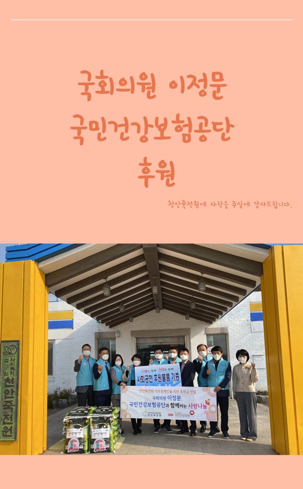 [후원]국회의원 이정문, 국민건강보험공단 페이지 정보 작성자 운영자 작성일21-11-18 17:15 조회324회 댓글0건 관련링크 목록 본문 2021.11.18.(목)국회의원 이정문, 국민건강보험공단에서 천안죽전원을 방문해 주셨습니다.후원 감사드립니다. 댓글목록 등록된 댓글이 없습니다. 목록