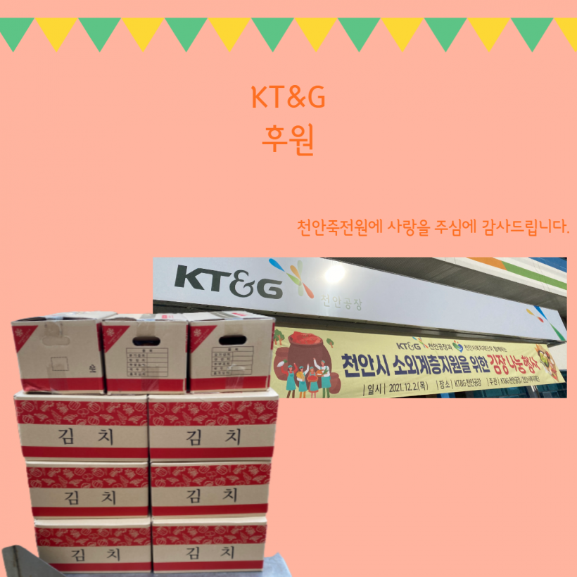 [후원] KT&G 페이지 정보 작성자 운영자 작성일21-12-02 17:29 조회294회 댓글0건 관련링크 목록 본문 2021.12.02.(목) KT&G 천안공장과 천안시복지재단에서김치후원을 해주셨습니다.감사합니다 :) 댓글목록 등록된 댓글이 없습니다. 목록