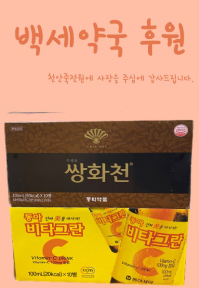 [후원] 백세약국 페이지 정보 작성자 운영자 작성일21-11-04 17:35 조회316회 댓글0건 관련링크 목록 본문 2021.11.04.(목) 백세약국에서 비타음료를 후원해 주셨습니다.매번 감사합니다~:) 댓글목록 등록된 댓글이 없습니다. 목록