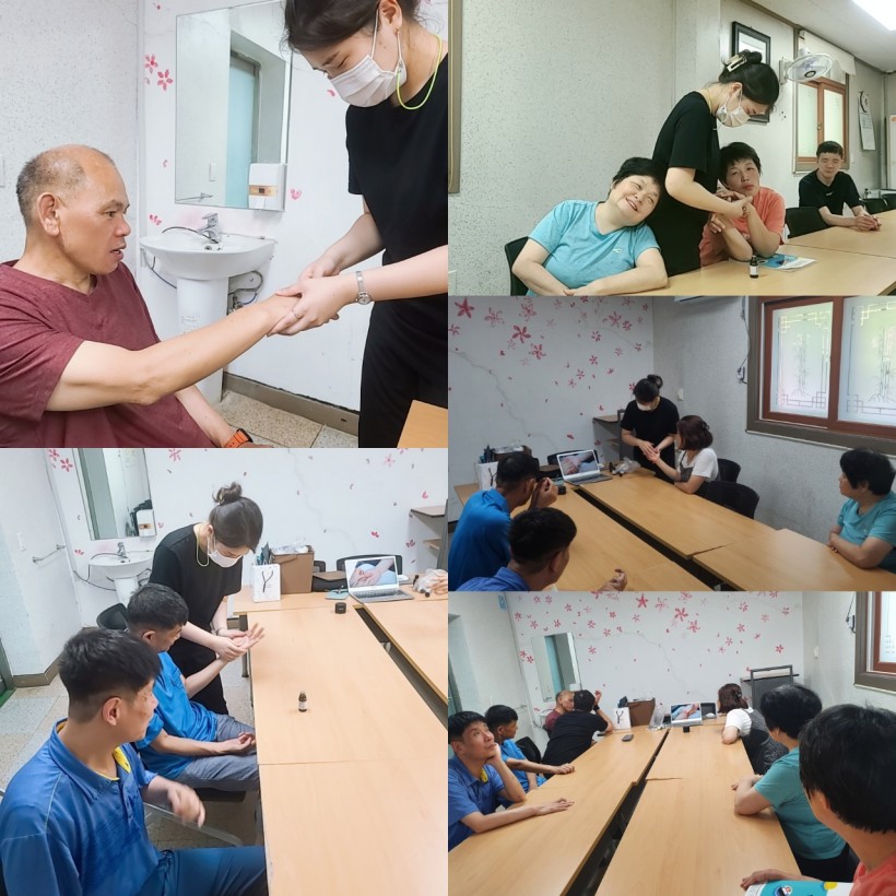 아로마테라피 프로그램에서 에센셜 오일로 대상자분들 손마사지를 해드렸습니다.
