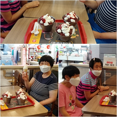 한낮기온이 36도까지 치속은 7월21일, 중식후 근처 롯**아에서 팥빙수를 먹으며 더위를 날렸습니다. 모두 시원한 팥빙수와 에에컨 바람에 더위를 식히며 나중에는 춥다는 소리까지 하는 행복함을 맛보았습니다.