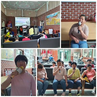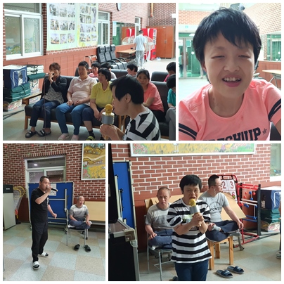 2021년 6월 5일 오후 1시 ~ 3시까지 천안죽전원 체력증진실에서 신나고 즐거운 노래방을 하였다. 노래를 사랑하는 사람들이 모여서 서로의 노래를 자랑하고 또 춤도 추시면서 한주의 스트레스를 풀수 있도록 즐거운 자리를 마련하였다. 참여하신 모든 가족들이 행복한 미소를 보이시면서 노래를 하시는 모습이 무척 보기에 좋아 보였다.