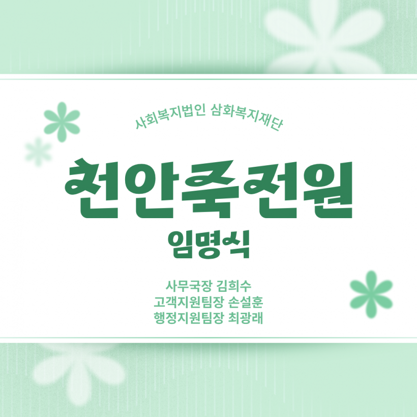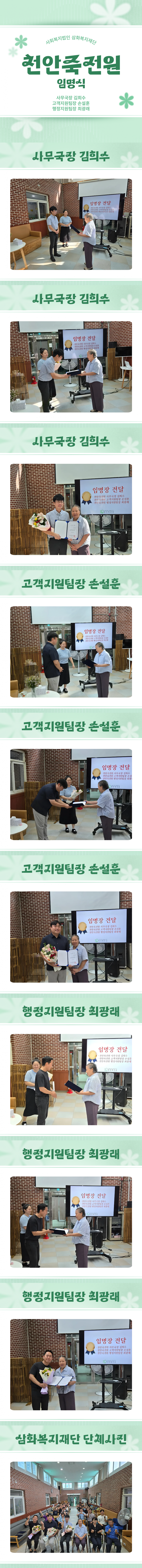 [9월] 사무국장 · 팀장 임명식 페이지 정보 작성자 운영자 작성일25-10-15 17:08 조회189회 댓글0건 관련링크 목록 본문 2025년 09월 01일(월) 김희수 사무국장님, 손설훈 고객지원팀장님, 최광래 행정지원팀장님 임명식을 진행하였습니다.천안죽전원 직원분들과 가족분들께서 뜨거운 박수와 힘찬 응원을 해주셨습니다. 댓글목록 등록된 댓글이 없습니다. 목록