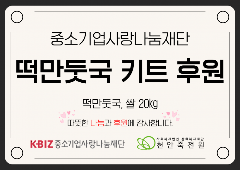 중소기업사랑나눔재단 떡만둣국키트, 쌀 후원 페이지 정보 작성자 운영자 작성일26-02-05 13:45 조회156회 댓글0건 관련링크 목록 본문 26.01.28.(수)중소기업사랑나눔재단 떡만둣국키트, 쌀 후원해주셨습니다.가족분들도 환하게 웃으시면서 맛있게 식사 하셨습니다.천안죽전원에게 사랑과 나눔을 해주신 중소기업사랑나눔재단에게 다시한번 감사의 말씀을 드립니다.감사합니다. 댓글목록 등록된 댓글이 없습니다. 목록