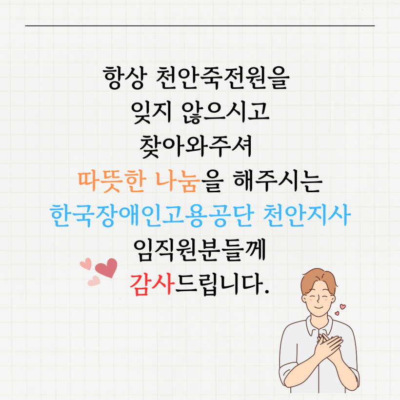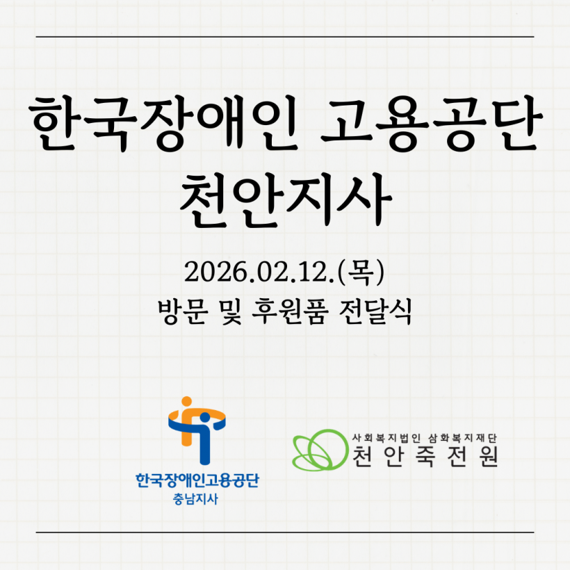 한국장애인고용공단 천안지사 방문 페이지 정보 작성자 운영자 작성일26-02-23 16:00 조회20회 댓글0건 관련링크 목록 본문 26.02.12.(목)한국장애인고용공단 천안지사에서 임직원분들이 방문해주셨습니다.항상 따뜻한 관심과 소중한 나눔을 해주시는 한국장애인고용공단 천안지사 임직원 분들께 감사드립니다. 댓글목록 등록된 댓글이 없습니다. 목록