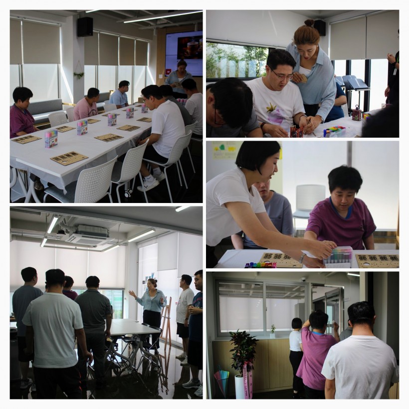 이후에는 강사님이 추석 명절에 딱 맞는 미술활동인 '나무 전통등 만들기'활동을 준비해 주셔서 다양한 색의 매직을 이용해 채색을 하고 조립한 후 색이 변하는 등을 넣어 나만의 멋진 나무 전통등을 만들어 보았습니다.