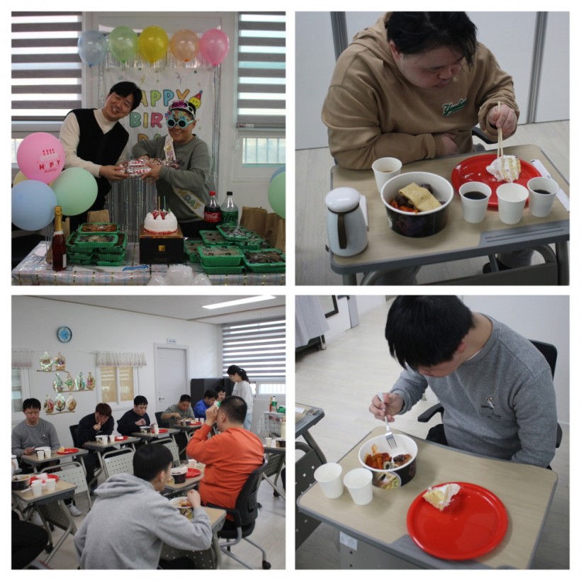 생일을 맞은 이용인을 위해 만든 축하 동영상도 보는 시간에는 TV화면에 자신의 모습이 나와서 인지 미소를 지으며 영상을 바라보는 모습을 보였고, 동료들이 생일 축하 노래를 부르니 같이 박수를 치며 노래를 부르는 모습을 보였습니다. 또한 케이크와 자치회의를 통해 결정된 생일파티 간식인 분식세트도 먹으며 환한 미소를 지으며 기뻐했고, 다른 이용자들도 함께 축하해 주며 따뜻한 분위기가 만들어졌습니다.