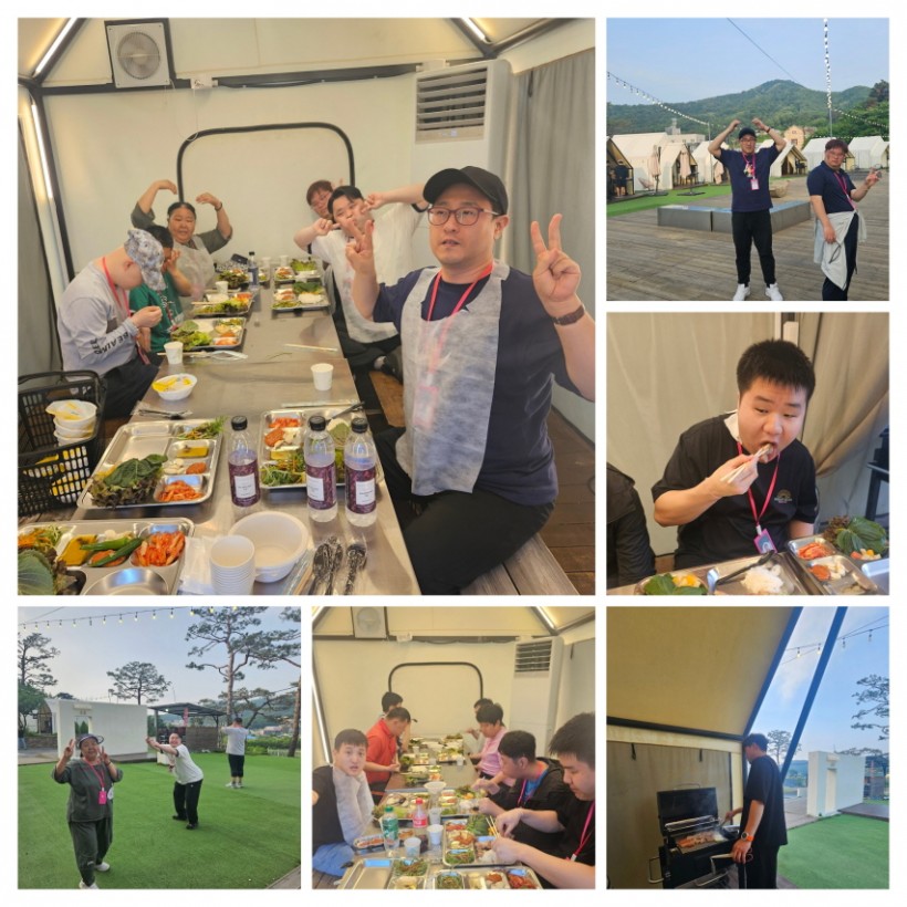 저녁 시간에는 캠핑 분위기가 물씬 느껴지는 바비큐 식당을 방문해 야외에서 직접 구운 고기와 다양한 음식을 함께 나눠 먹으며 하루를 마무리했습니다.