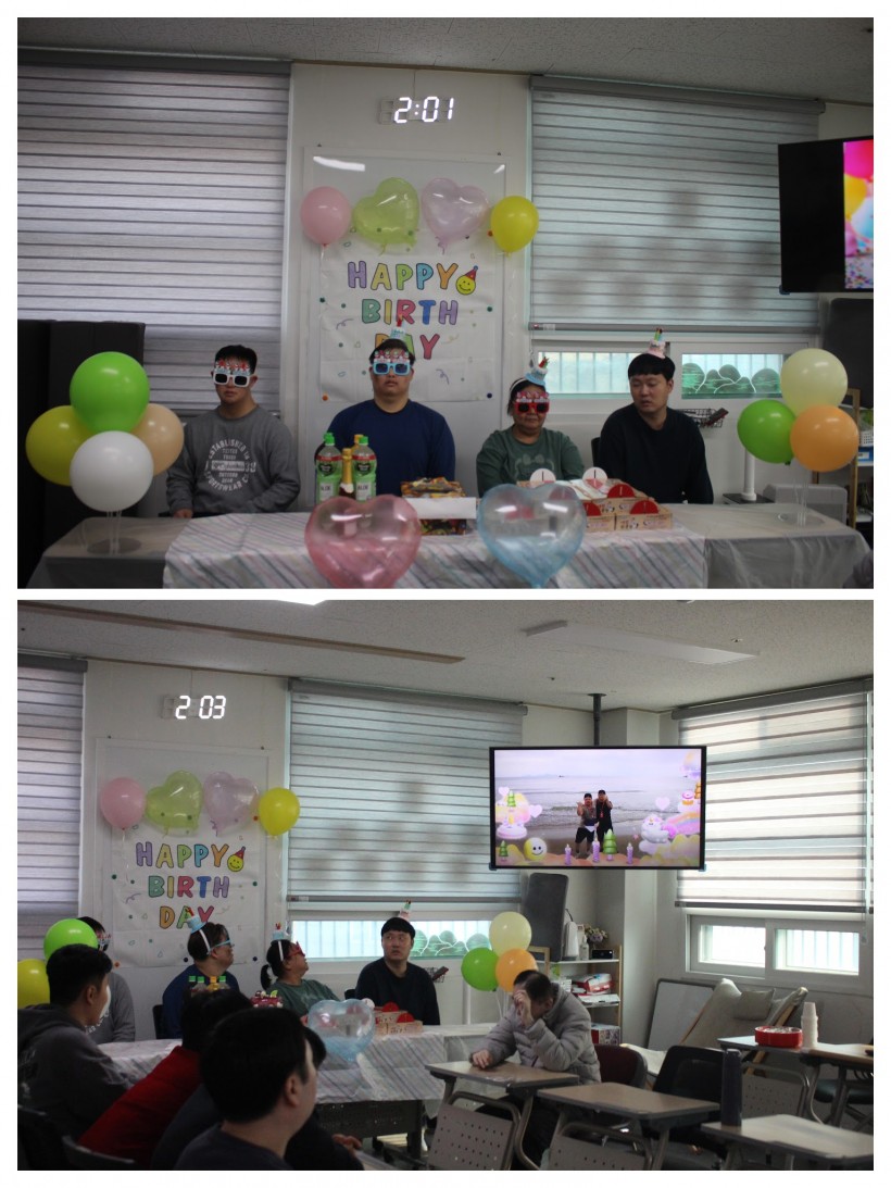오랜만에 생일파티를 진행해서 그런지 파티 준비를 할 때 부터 들뜬 모습을 보였고, 생일자들은 멋진 안경과 생일모자를 쓰고 주인공 자리에 앉아 준비된 생일축하영상을 본 후 동료들이 생일축하곡을 불러주었습니다.