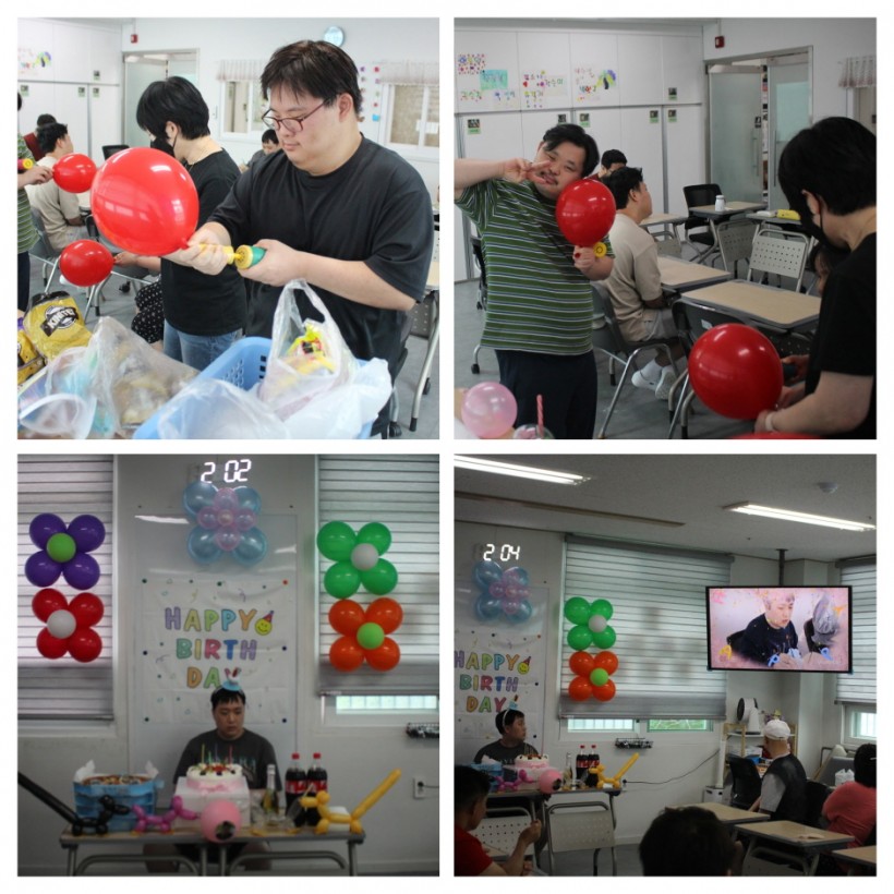 이용인이 직접 동료의 생일을 축하해 주기 위해 풍선 장식도 하고, 현수막도 걸어 생일파티 분위기를 연출하였고, 생일을 맞은 동료를 위한 축하영상을 본 후 생일축하곡을 불러주었습니다.