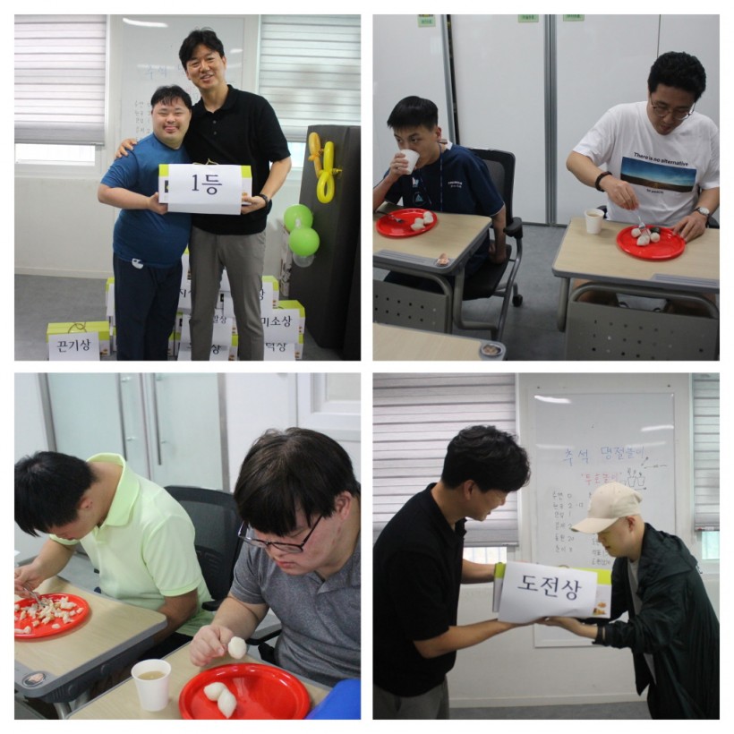 시상식 시간에는 1등, 2등, 3등에만 선물을 전달하는 것이 아니라, 재치상, 미소상, 웃음 유발상 등 재미를 더한 상을 만들어 모두에게 시상을 하니 이용인들이 더욱 행복해하는 모습을 보였고, 당일 만든 송편도 맛있게 먹으며 추석 행사를 마무리하였습니다.
