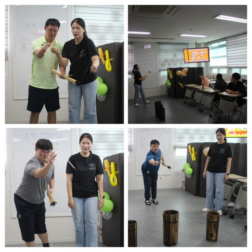 저희 센터에서는 추석 특별활동으로 신나는 민요를 들으며 투호놀이도 하고, 간식으로 추석의 대표 음식인 송편과 식혜를 먹는 시간을 가져보았습니다.
