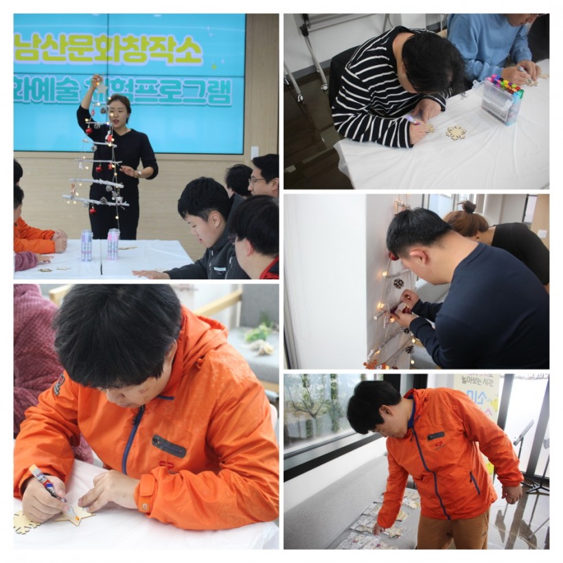 11월에는 미술 작가님의 지원으로 '크리스마스 벽트리 꾸미기'활동을 진행하였는데 벽트리를 꾸밀 장식을 다양한 색의 매직을 이용해 채색하여 직접 벽트리에 달아보아 멋진 크리스마스 벽트리를 완성하였습니다.