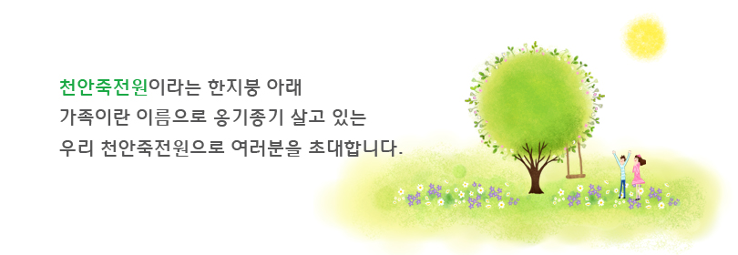 천안죽전원이라는 한지붕 아래 가족이란 이름으로 옹기종기 살고 있는 우리 천안죽전원으로 여러분을 초대합니다.
